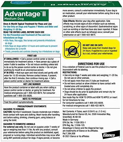 This 30-day treatment effectively breaks the flea life cycle, controlling existing flea and lice infestations and preventing further infestations all month long. Fleas not only cause discomfort; they can also pose other health risks. Monthly use of Advantage II Medium Dog is important to protect your dog against fleas that may cause transmission of tapeworms in dogs, Flea Allergy Dermatitis and flea bite anemia.
