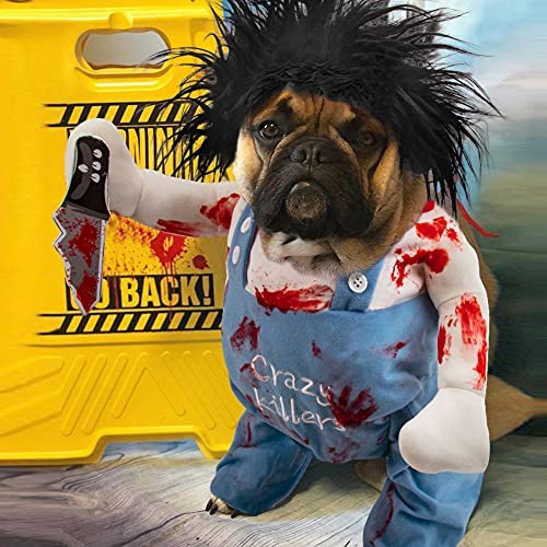 [PREMIUM MATERIAL] Our pet costume is made of skin-friendly materials. Be your friend until you end. The scary doll dog costume is a padded body with additional padding arms and trousers sleeves. It comes with a connectable foam knife and a wig. The body is tied behind with two ropes. The wig is characterized by a pierced incision and a flexible chin strap.