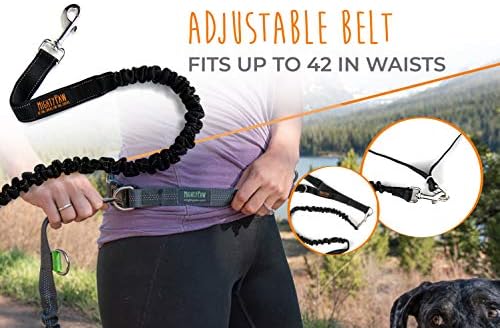 Universal Fit for All Sized Pups: Our bungees come in both 3 foot (36 in) and 4 foot (48 in) so you can go on an adventure no matter what breed dog you have and our belt can fit up to a 42” waist!
