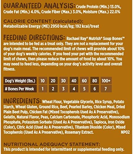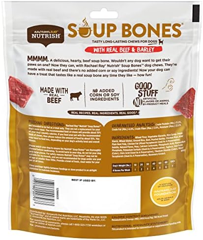 Savory long-lasting chews made with real beef. Rachael Ray Nutrish Soup Bones Beef & Barley Flavor are made with real beef and hearty barley. These long-lasting chews have all the deliciousness of a wholesome soup bone with a tender, meaty center inside.