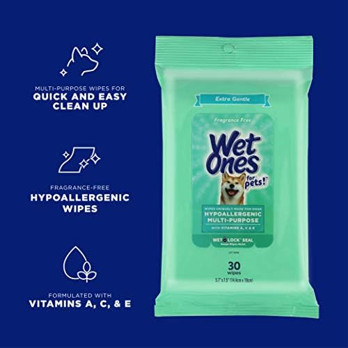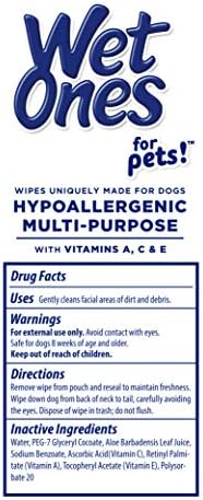 Wet Ones for Pets Hypoallergenic Multipurpose Wipes for Dogs are designed with your pet in mind for a quick, gentle, & healthy clean anytime, anywhere! These hypoallergenic wipes for dogs are a fragrance-free way to keep your pet comfortable and clean. The wipes for dogs are non-irritating, making them great for dogs with sensitive skin. Multi-purpose dog wipes remove dirt and dander while reducing allergens. They’re great wipes for dogs to use in between baths. These safe, easy to use hypoallergenic dog wipes are formulated with Vitamin A, C & E to naturally soothe, hydrate, and calm skin to help maintain a healthy, shiny coat . The 30 count pouch comes with a Wet Lock seal to maintain freshness. Made specifically for pets and safe for use after outdoor playtime or indoors, these Wet Ones antibacterial wipes keep and your home clean and smelling fresh. Directions: 1. Remove wipe from pouch and reseal to maintain freshness. 2. Wipe down dog from back of neck to tail, carefully avoiding the eyes. 3. Dispose of wipe in trash, do not flush. WARNINGS: For external use only. Safe for dogs 8 weeks of age and older. Avoid contact with eyes. Keep out of reach of children. WET ONES is a trademark of Edgewell Personal Care Brands, LLC and is used under license. ?2020 Edgewell. WET ONES and WET LOCK are trademarks of Edgewell Personal Care Brands, LLC and are used under license. ?2020 Edgewell. YOUR SATISFACTION IS OUR PRIORITY: If you have any questions or feedback, please reach out to us at Fetch 4 Pets.